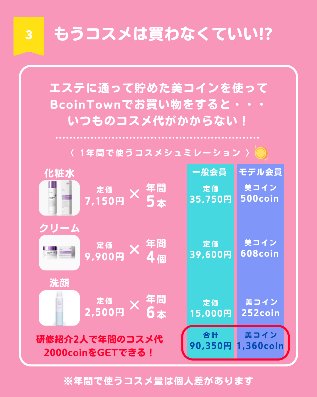 「キレイになりながら、お得にコスメも手に入る」へ。
