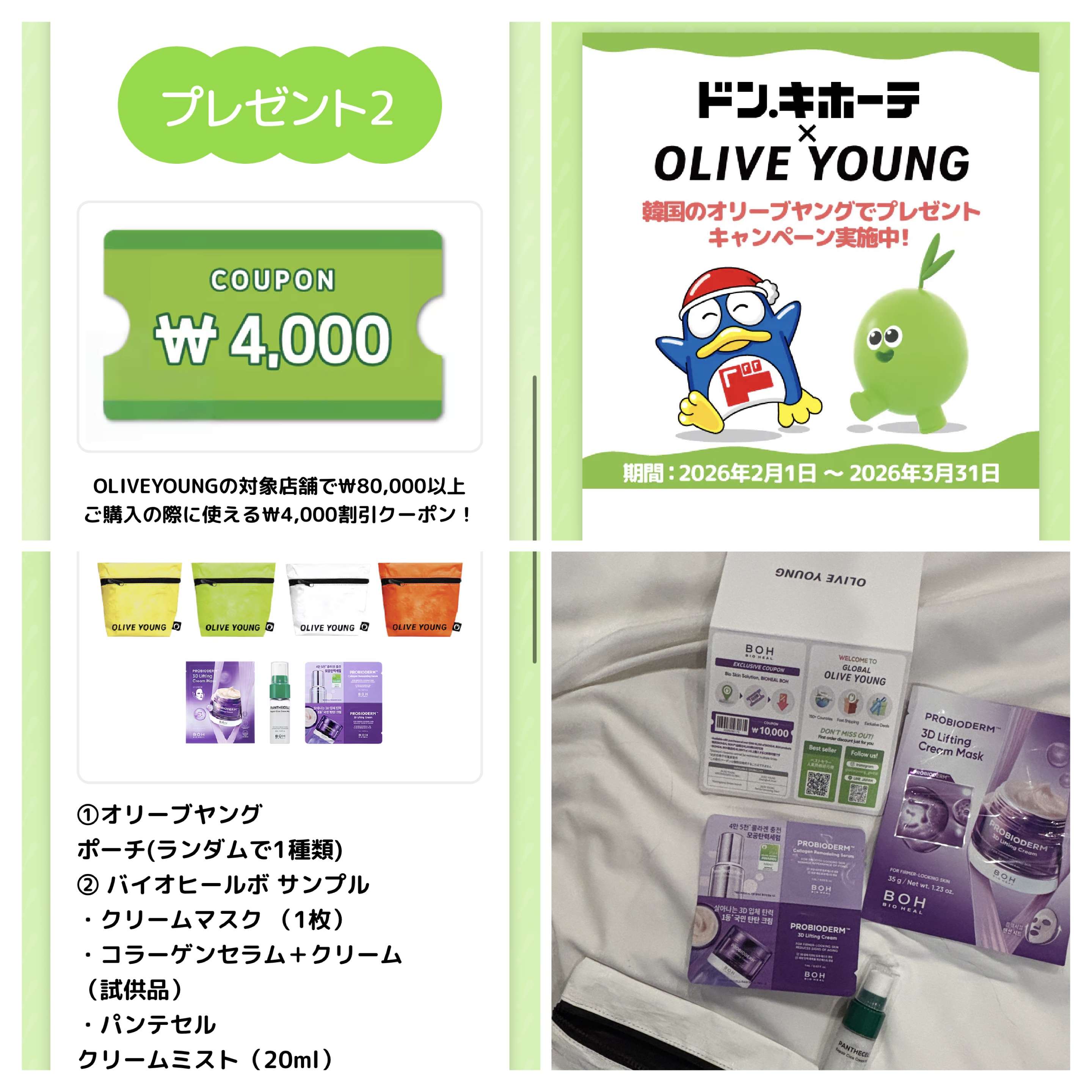 一つ目は…渡韓前ドン・キホーテで買い物した時に気がついた。Majicaアプリでドンキホーテと韓国のオリーブヤングのキャンペーンがあることを知った。買い物をするだけで、ポーチと化粧品のサンプルがもらえる。いつもは軽くてお土産も喜ばれるベーグルチップや自分が運動後に飲むプロテイン(一回分がパウチに入っていて水を入れるだけで手軽に飲める)をたくさん買うのでプレゼント2.の対象金額(80,000ウォン)は超えるが今回は控えめに買ったので割引は使えなかった。