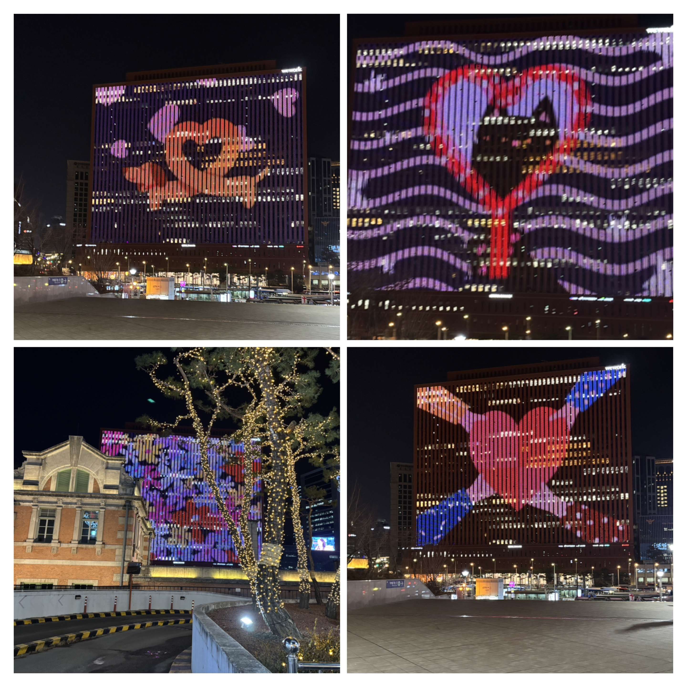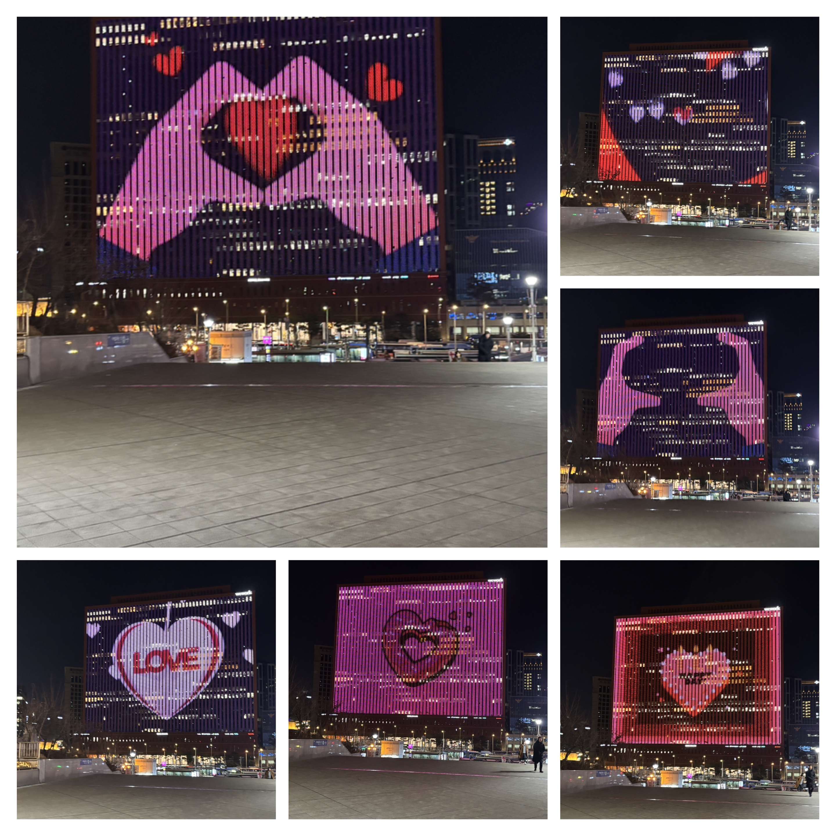そこに行くと必ず目にするソウルスクエアビル。ビル全体が巨大なスクリーンになっていて静止画ではなく、絵が動くのでいつまで見ていても飽きない。特に先月はバレンタインデーがあったからかハートがいっぱいで可愛かった。