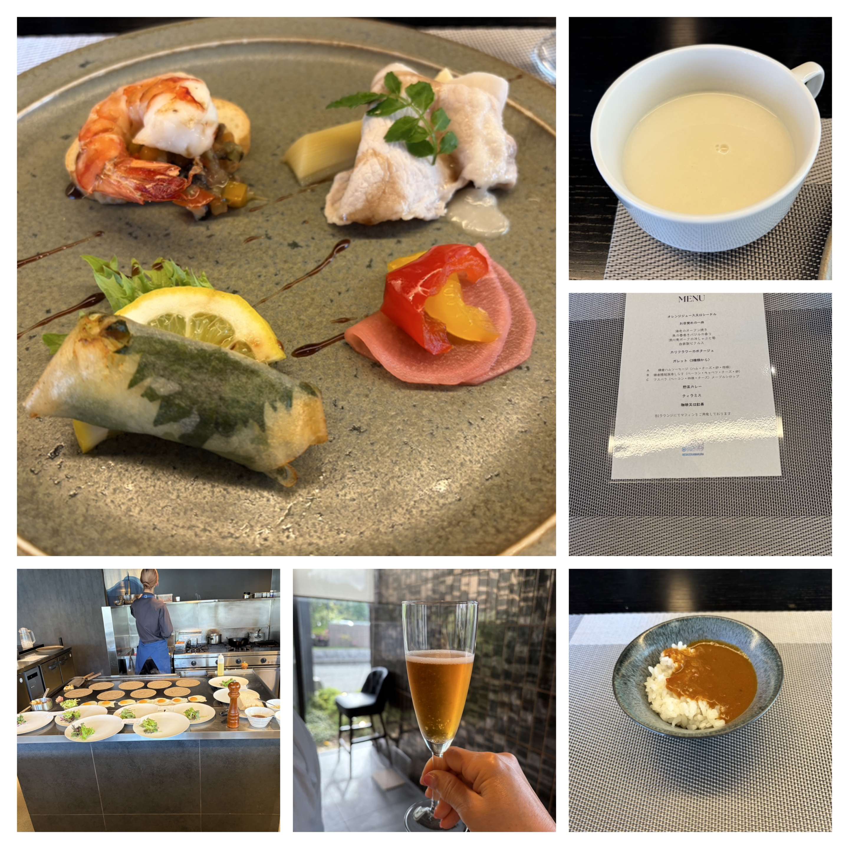 ホテルに併設されたレストランで鉄板焼き6品のディナーをいただいた。 「ウニと蕪」蕪のムースが新鮮だった 「初カツオと三浦野菜」カツオがスモークされていて美味しかった 「フォアグラと新ごぼう」新ごぼうは味が濃すぎたが、こんなに美味しいフォアグラは初めてだった!畑をイメージしたプレーティングも良かった。 「...