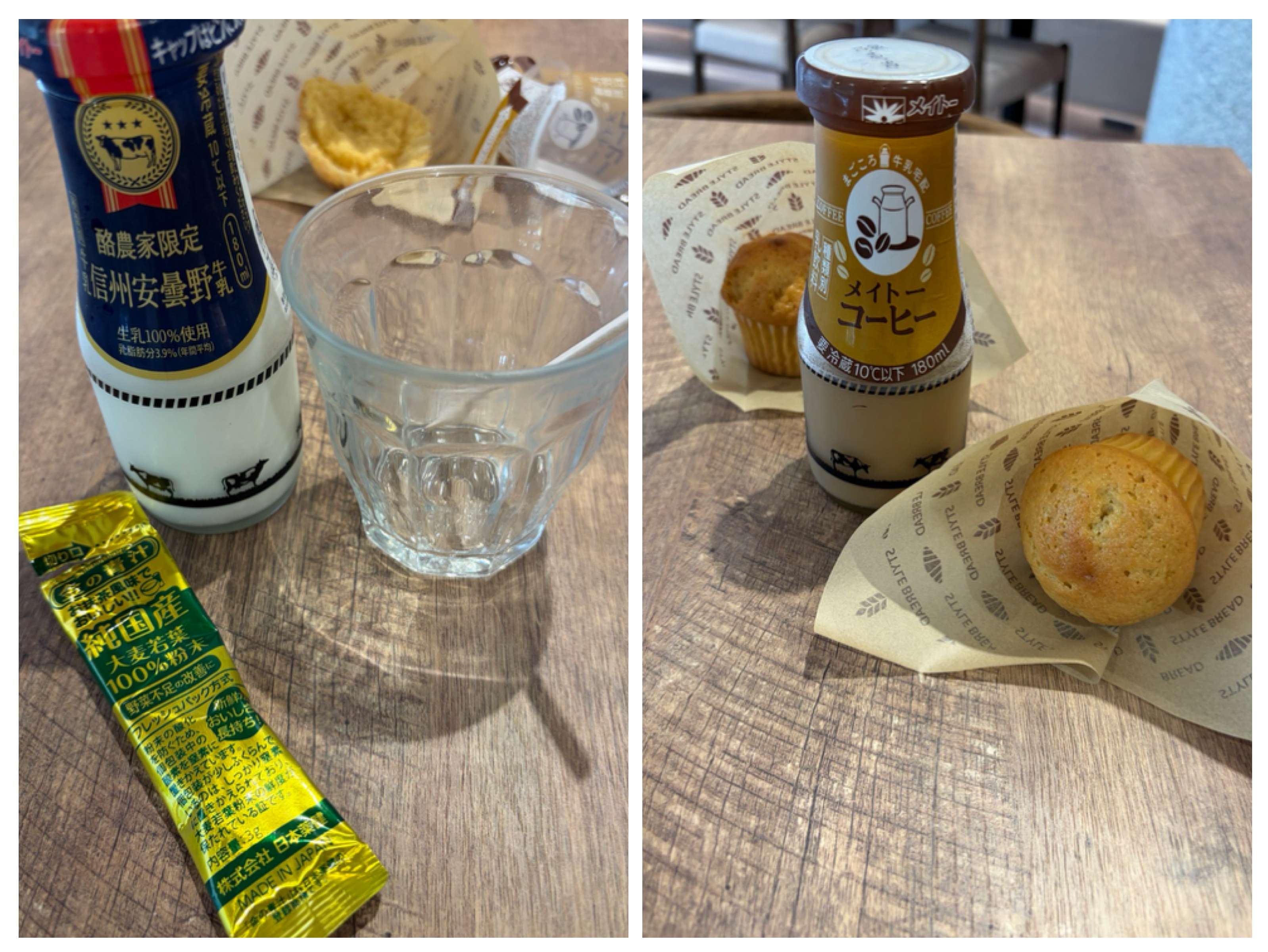 冷凍のマフィンをオーブンで温めていただいた。青汁を牛乳で作ると美味しいそうなので飲んでみた。お腹いっぱいだけど美味しかった。