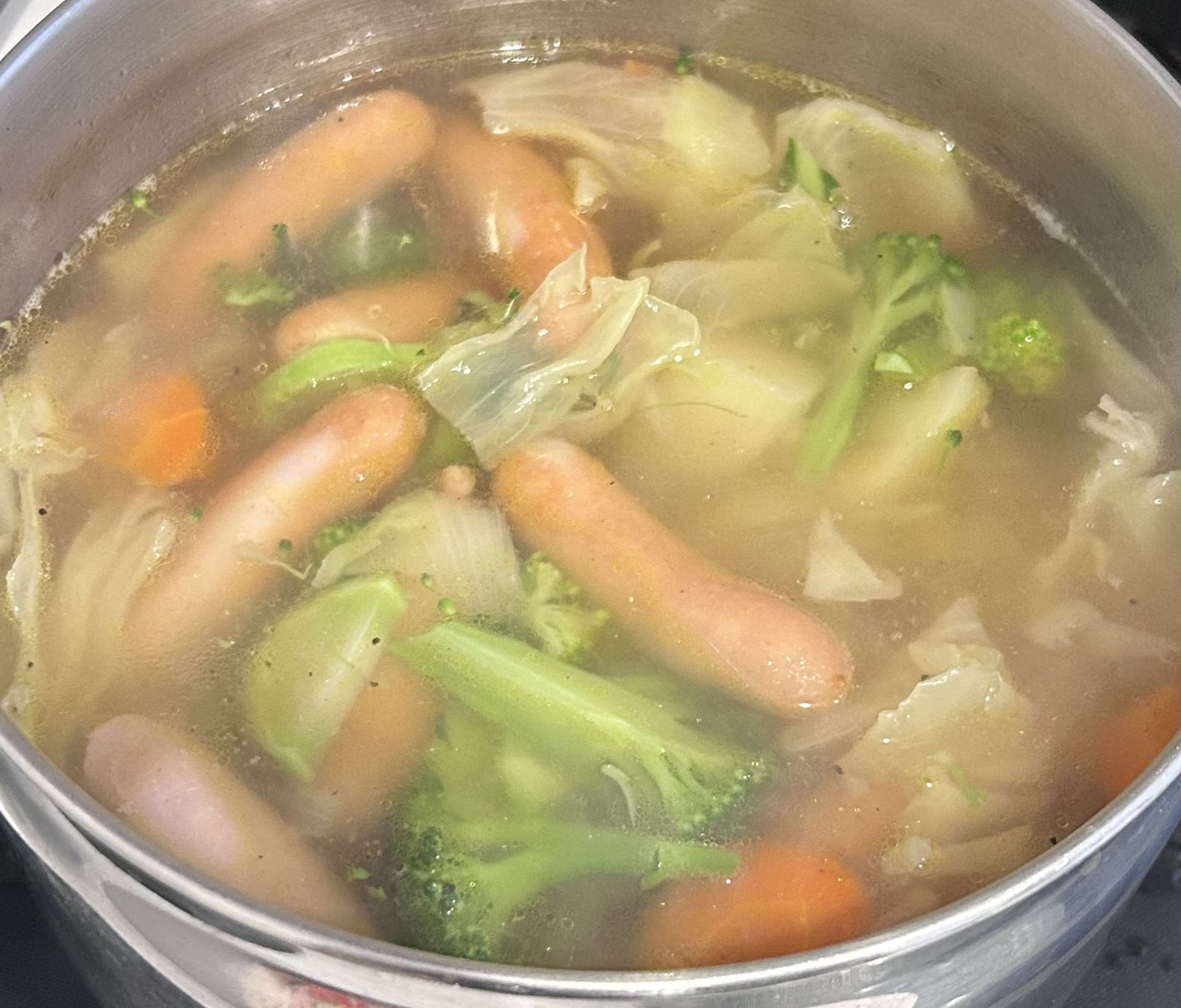 コンソメで煮込むだけですが、前日妹が、『ポトフのキャベツは炒めると良い』と言っていたので、そのようにしました。