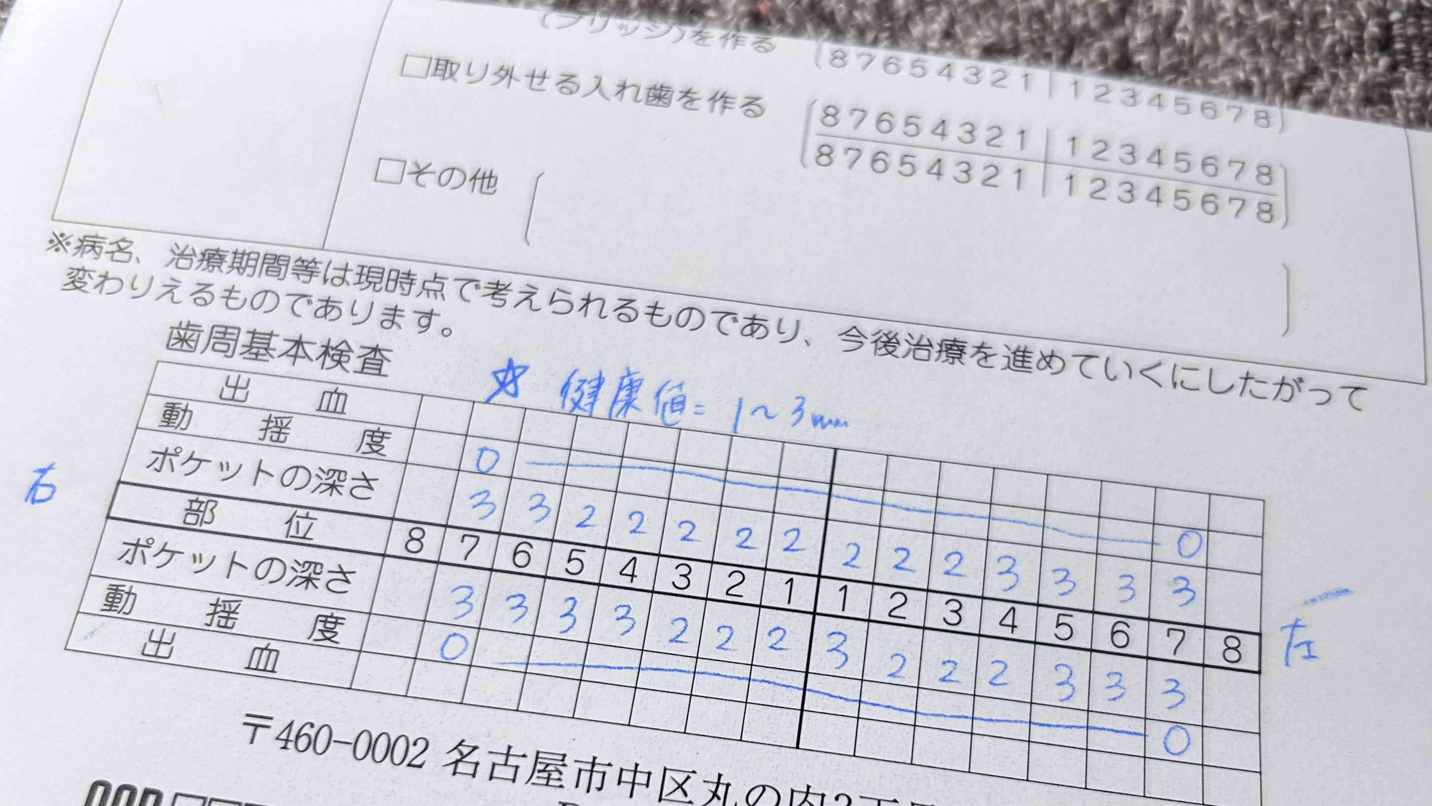先生のチェックの後、歯周ポケットの深さを測って、健康値1〜3ミリですが、特に問題なしでした。